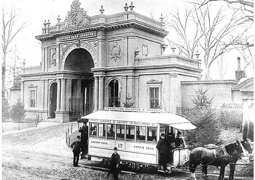 The ornate gateway to Loudon Park Cemetery, which was built in the 1850s and later demolished for the structures existing in 1998. Photo shows a horsecar of the Baltimore, Catonsville and Ellicott's Mills Railway with destination signs for Carrollton, Irvington and Paradise on its side. By 1883 the line had come under the control of the United Passenger Railway.